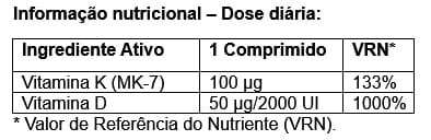 Agente de volume: celulose microcristalina, Colecalciferol (vitamina D), Amido, Menaquinona-7 MK-7 (vitamina K) derivada de Bacillus subtilis natto, Anti aglomerantes: sais de magnésio de ácidos gordos, dióxido de silício.