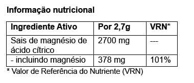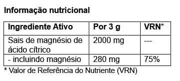 Sais de magnésio de ácido cítrico, Regulador de acidez: ácido cítrico, Aromas, Adoçante: sucralose.