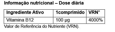 Cada comprimido contém 100 µg de vitamina B12, garantindo uma dose equilibrada e prática para uso diário.
