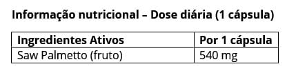 À base de extrato de fruto de Serenoa repens (saw palmetto), contém 540 mg de pó de fruto por cada cápsula, composição tradicionalmente utilizada em suplementos masculinos que apoiam uma função urinária equilibrada e um estilo de vida ativo ao longo dos anos.